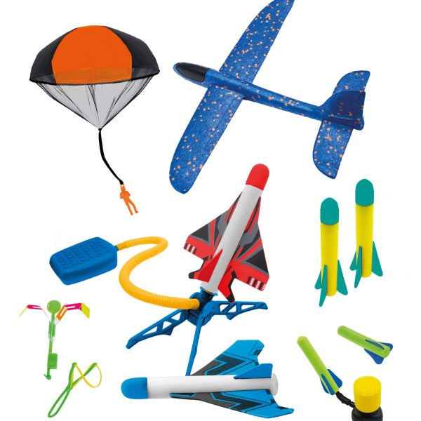 Zestaw 6 rodzajów latających zabawek jest gotowych na testowe loty! Latająca nauka to zestaw zawierający rakiety, odrzutowce, szybowce, spadochrony itp.