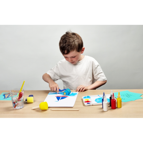 Zestaw do rysowania i malowania przy użyciu różnych technik (malowanie przy pomocy gąbek, stemplowanie, malowanie pędzelkiem czy odrysowywanie szablonów). Posiada