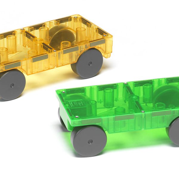 Uruchom silniki! Zestaw do rozbudowy Cars 2-elementowy wprowadza Magna-Tiles® w ruch dzięki parze kołowych, magnetycznych podwozi, na których można budować.