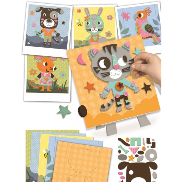 Zestaw plastyczny do zrobienia 5 obrazów techniką kolażu. Obrazy przedstawiają zwierzęta domowe. Zestaw zawiera wszystko co jest potrzebne do realizacji