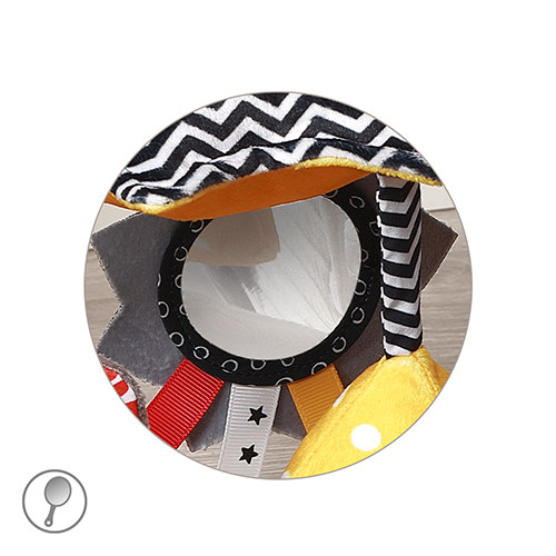 Wyposażyliśmy ją w dwie grzechotki i szeleściki, które pobudzają słuch, kolorowe metki i zakręcony ogonek motywujące do chwytania, a także bezpieczne lusterko do poznawania własnego odbicia. Stworzyliśmy ją w kontrastowych kolorach i z geometrycznymi wzorami, by rozwijała wzrok już od pierwszych miesięcy życia.