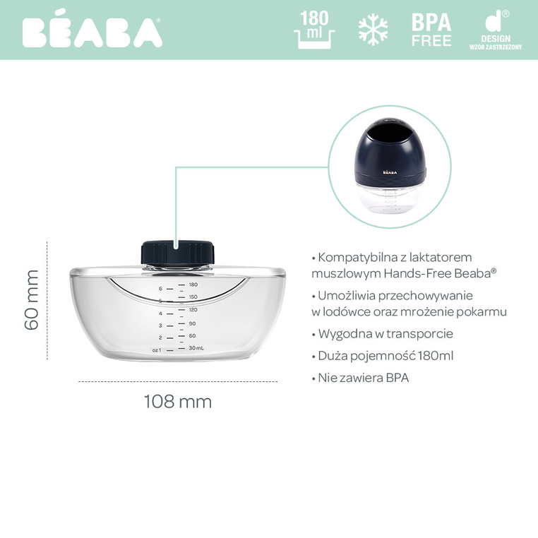 Dodatkowy pojemnik-butelka na mleko o pojemności 180 ml, kompatybilna z laktatorem muszlowym Hand-free francuskiej marki BEABA. Posiada czytelną podziałkę na mililitry (ml) i uncje (oz) oraz szczelną nakrętkę. Idealna do zbierania, transportu i przechowywania mleka matki. Nadaje się do chłodzenia i mrożenia.
