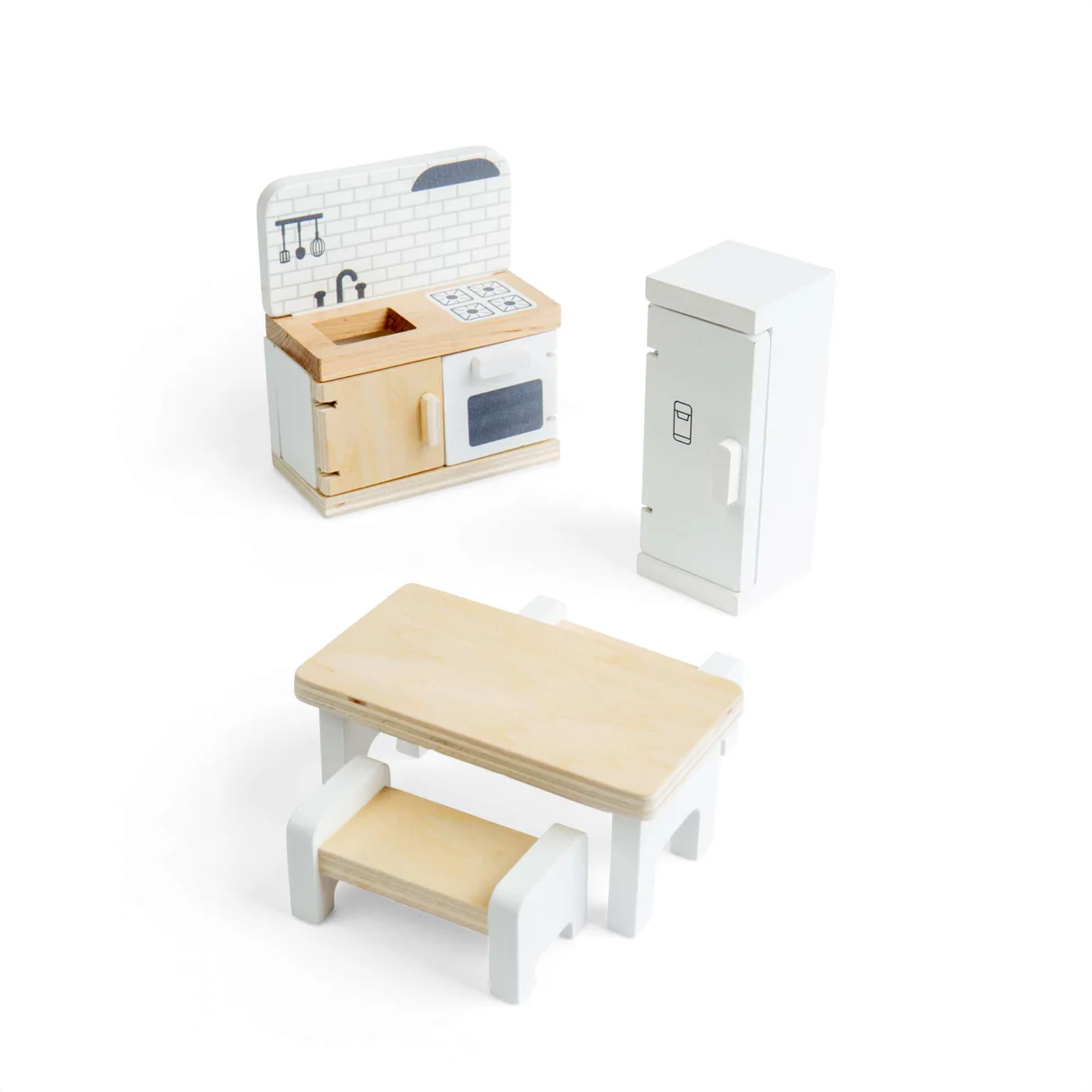 Zestaw do kuchni od Bigjigs Toys, zawiera: szafki kuchenne, lodówkę, stół oraz ławy do siedzenia.