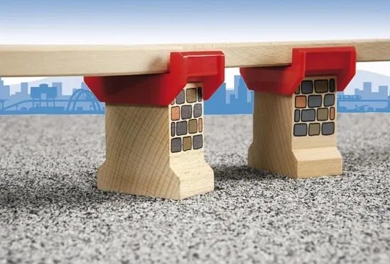 Drewniane wsporniki do mostów pomogą urozmaicić trasę kolejową. Można je ustawić obok siebie albo jeden na drugim, tworząc wyższy most. Nowe konstrukcje ćwiczą wyobraźnię przestrzenną i motorykę dziecka.