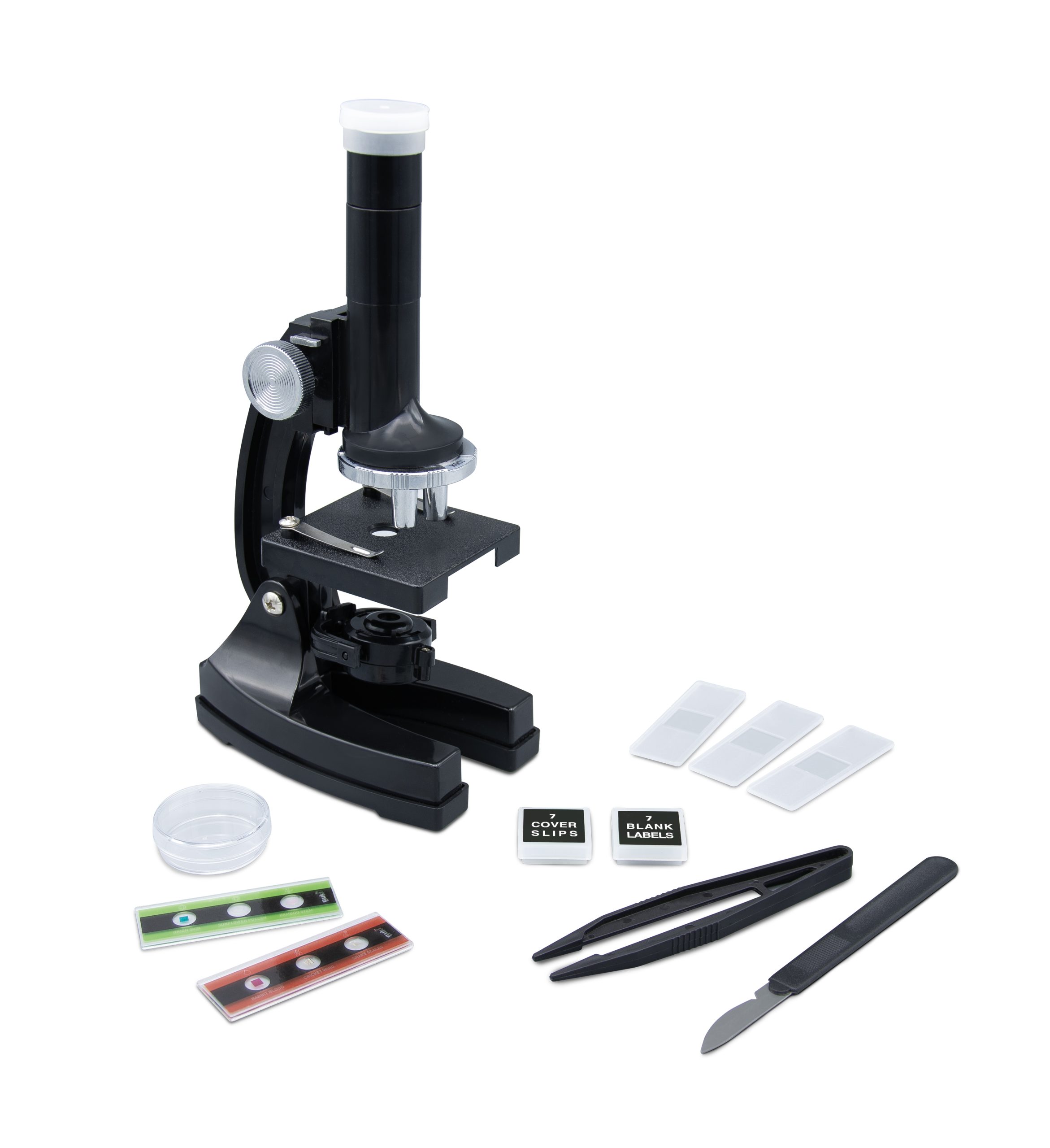 Zestaw zawiera gotowe próbki do obserwacji: cebuli, pyłku kwiatowego, skrzydła owada i komórek krwi.