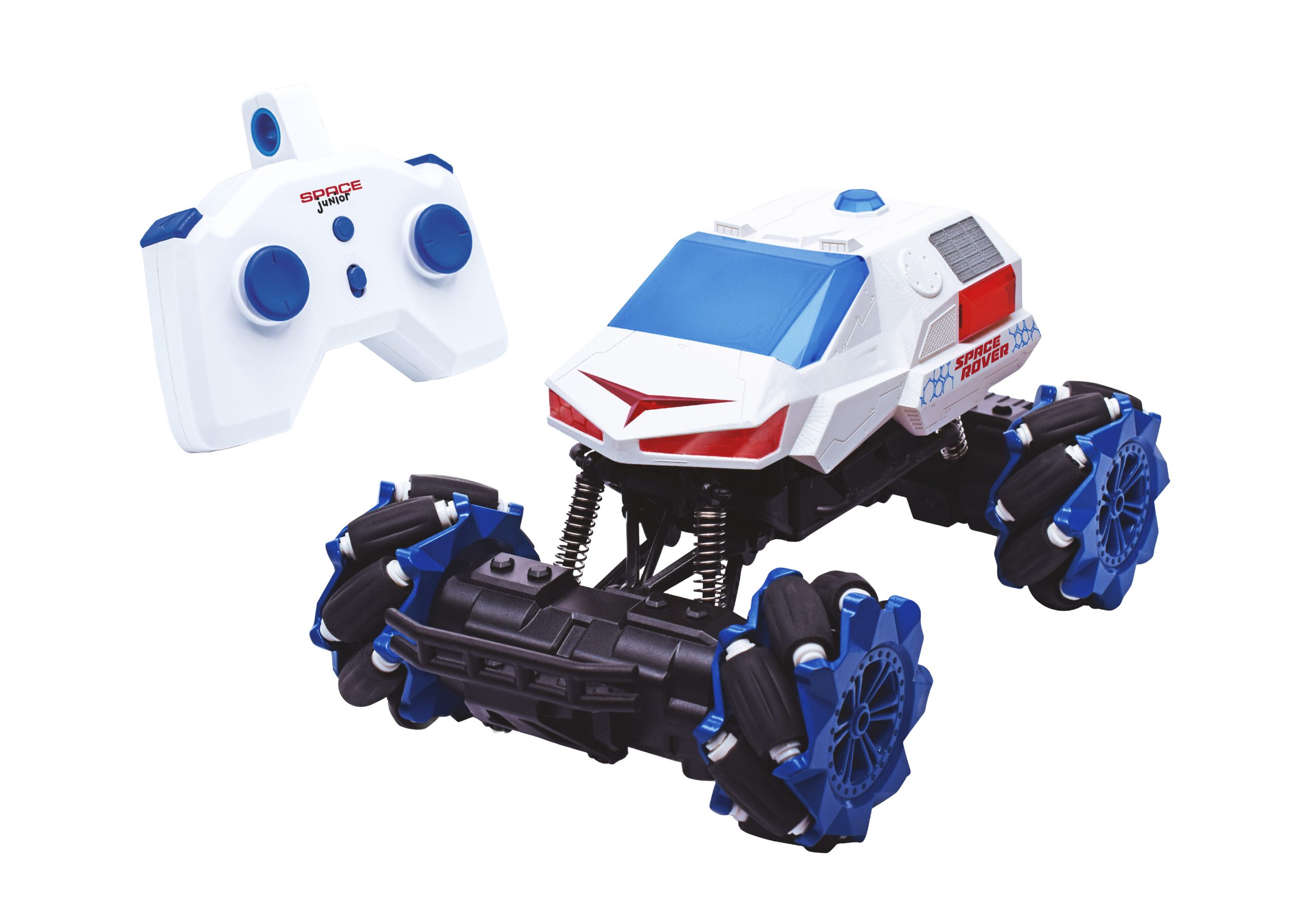 Zdalnie sterowany pojazd kosmiczny marki BUKI. Mierzący 24 cm samochód porusza się w przód i w tył oraz na boki. Zabawka posiada efekty świetlne, między innymi podświetlaną przednią szybę.
