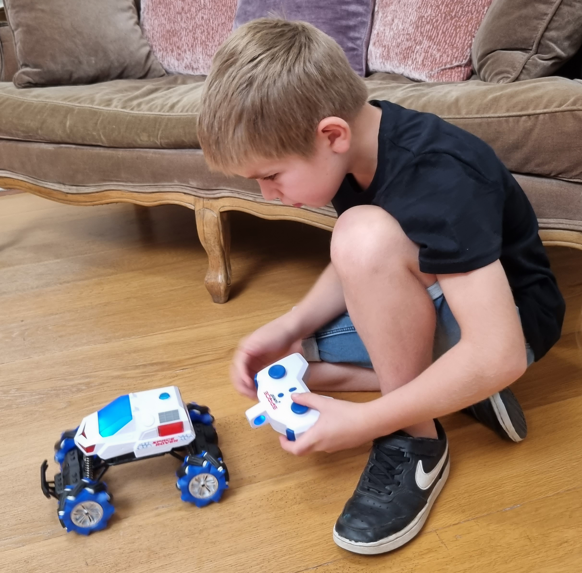Zasięg samochodu: 40 metrów, 2,4GHz. Rozwija prędkość do 5 km/h. Czas pracy na akumulatorze: 25 minut.