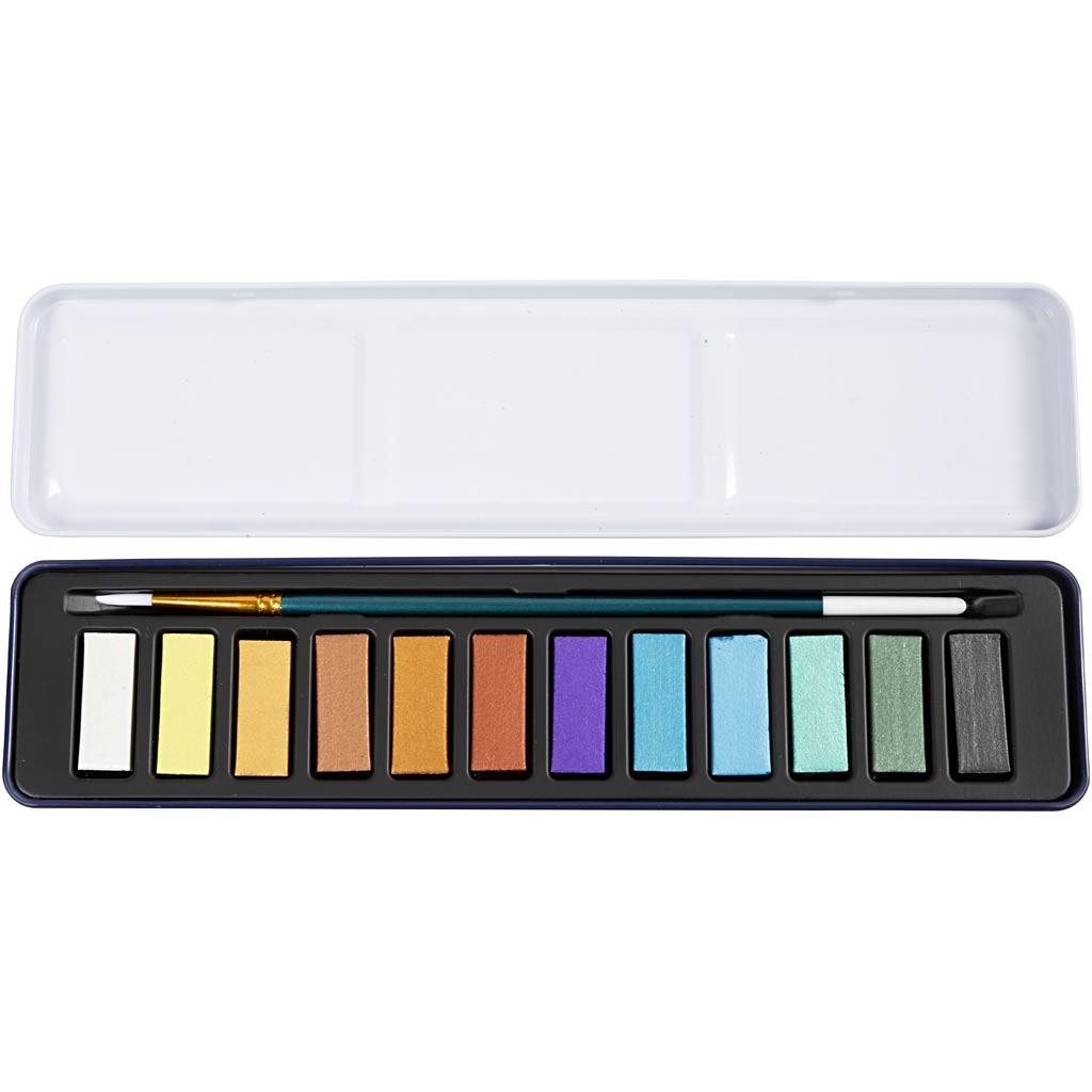 Paleta farb akwarelowych w 12 metalicznych kolorach. W zestawie pędzelek. Idealne dla miłośników malowania – nawet w podróży.