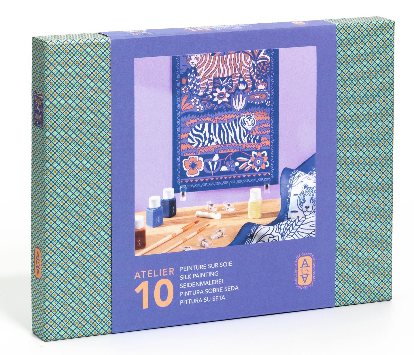 Atelier Grands Augustins – kolekcja zestawów artystycznych dla dorosłych – prezentuje technikę malowania na jedwabiu. Odkryj sztukę ozdabiania materiałowej apaszki krok po kroku, we własnym tempie i w domowym zaciszu. Zestaw Atelier 10 zawiera wszystkie niezbędne narzędzia i akcesoria do stworzenia chusty w tygrysy w odcieniach fioletowego i pomarańczowego.