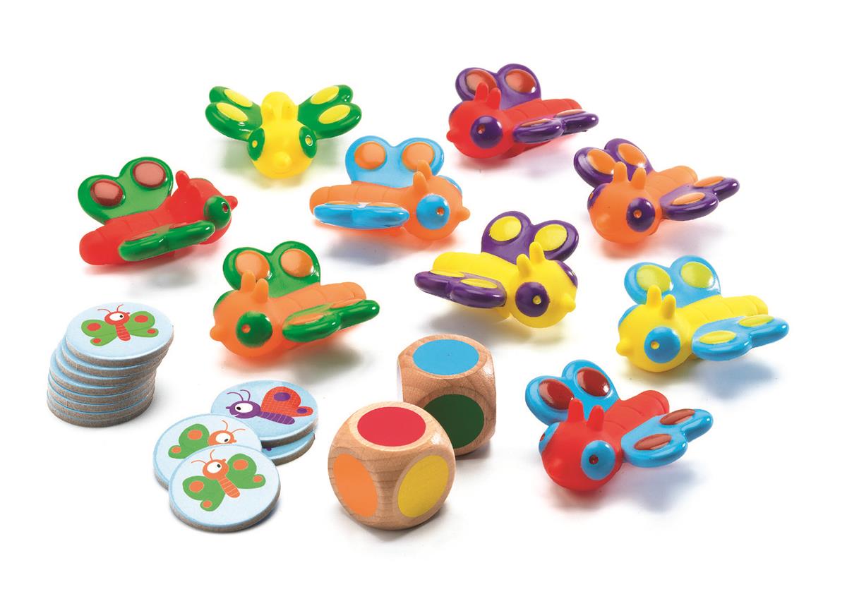 Przepięknie wykonana gra dla dzieci od 2 lat. Rzuć dwoma kostkami naraz i znajdź motylka w kolorach które wypadły na kostkach. Duże drewniane kostki, śliczne gumowe motylki, którymi po zakończeniu gry dziecko może się dowolnie bawić. Zawartość: 9 gumowych motylków, 2 kostki, 30 żetonów nagród.