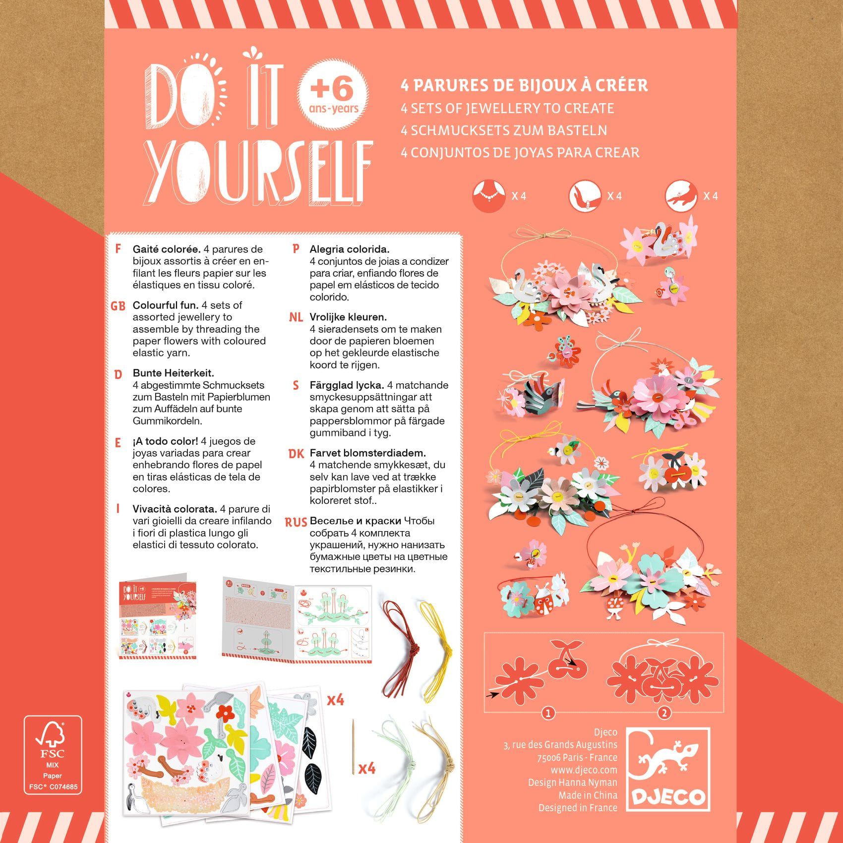 Zestaw do stworzenia 4 zestawów papierowej biżuterii z kolorowych kwiatów. Komplet biżuterii składa się z pierścionka, bransoletki i naszyjnika.