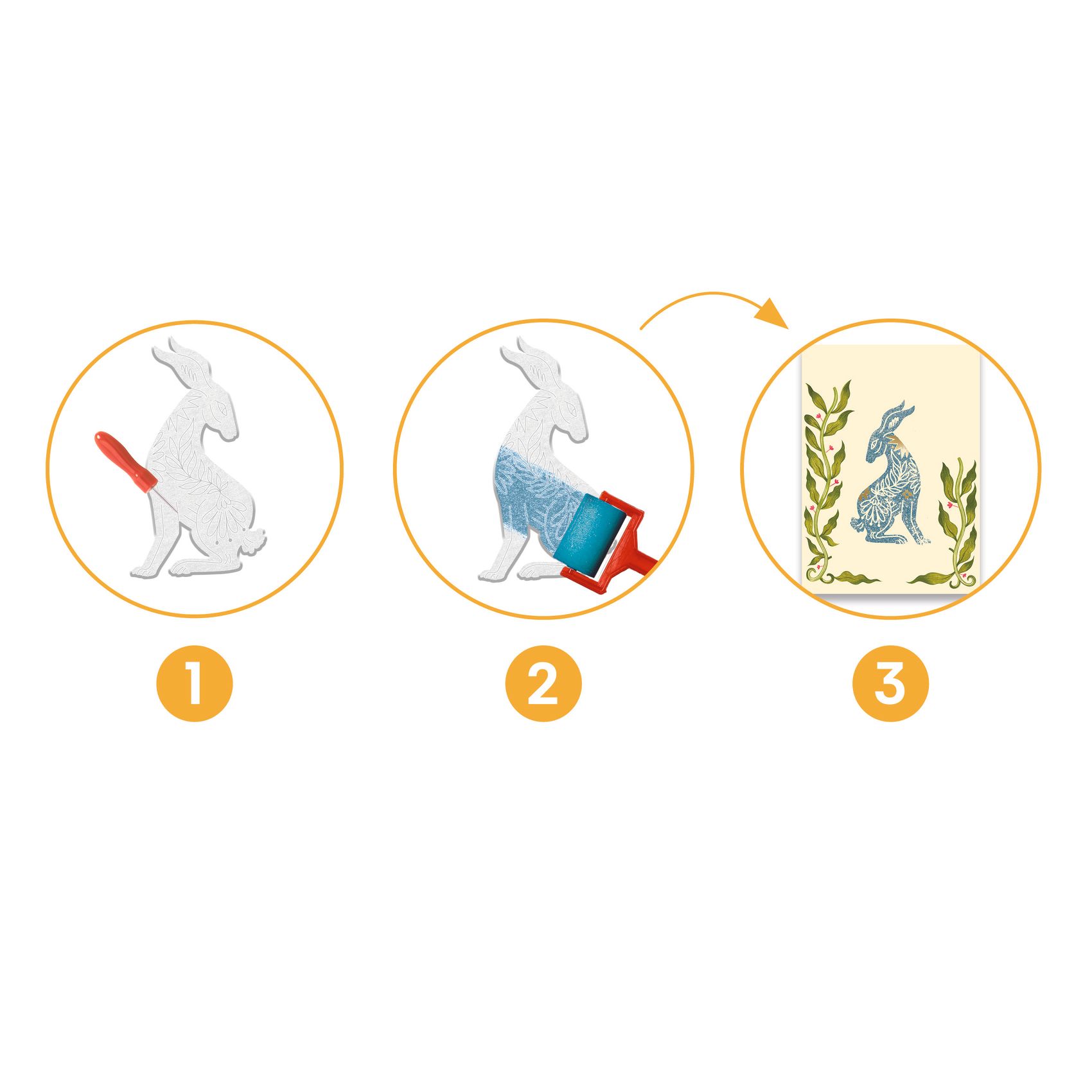 Powstałe pieczątki należy pomalować wałkiem zamoczonym w farbie i odcisnąć na ilustrowanych kartach. Odbity wzór będzie odwzorowaniem wydrążonych wcześniej linii. Folia transferowa posłuży do dodatkowych zdobień.