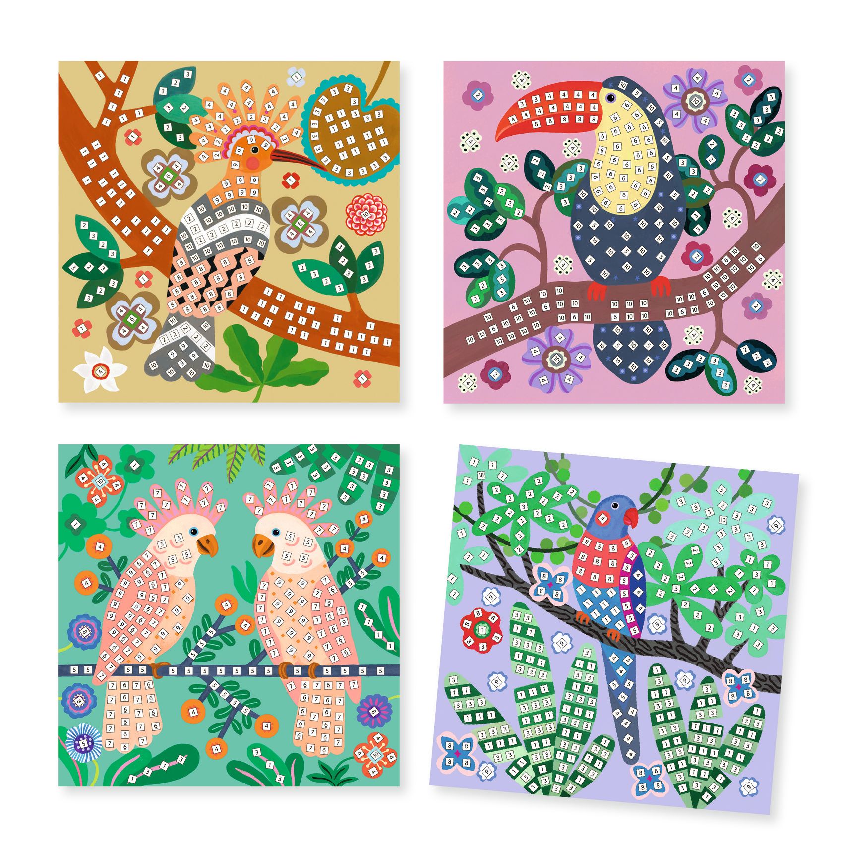 Zestaw artystyczny do tworzenia mozaik. Przepięknie ilustrowane plansze posiadają specjalnie oznakowane pola, na które przykleja się odpowiednie elementy. Każdy arkusz z naklejkami jest oznaczony liczbą. Grafiki przedstawiają bajeczne ptaki z całego świata.
