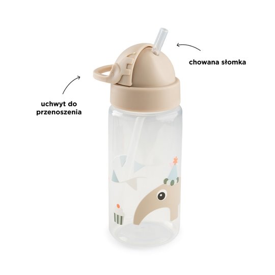 Poręczny i funkcjonalny bidon z rurką jest idealny dla spragnionych Maluchów. Butelka zawiera przesuwaną klapkę ułatwiającą korzystanie z bidonu. Skonstruowany w taki sposób, aby zapobiegać niepotrzebnym wyciekom płynu. Posiada uchwyt do przenoszenia który pomoże małym rączkom w łatwy sposób dostać się do słomki. Wykonany z wytrzymałego, a przede wszystkim bezpiecznego materiału. Bidon ze słomką jest przeźroczysty dzięki czemu w każdej chwili można kontrolować ilość płynu w butelce. Kolorystyka i wzór bidonu dla dziecka sprawi, że dziecko z większą chęcią będzie po niego sięgało. Idealnie sprawdzi się podczas spacerów, na wycieczce lub w przedszkolu.