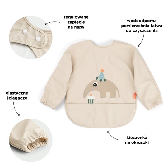 Wodoodporna powierzchnia i rękawy zapewniają, że ubrania pozostają suche i czyste, a dodatkowo bardzo łatwo je wytrzeć. Regulowane podwójne zapięcie na nap zapewnia wygodne, bezpieczne dopasowanie, a uroczy beżowy kolor z motywem mrówkojada Antee dodaje zabawnego akcentu do posiłków.