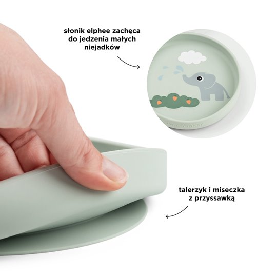 Silikonowy talerzyk i miseczka posiadają specjalną przyssawkę, która sprawia, że pozostają nieruchome, pomagając tym samym maluchom opanować umiejętność samodzielnego spożywania posiłku. Rodzic z łatwością może odczepić przyssawkę od stołu za pomocą małego uchwytu niewidocznego dla dziecka. Talerzy i miseczka posiadają zaokrąglone wewnętrzne krawędzie, które ułatwiają dziecku samodzielne nabieranie jedzenia.