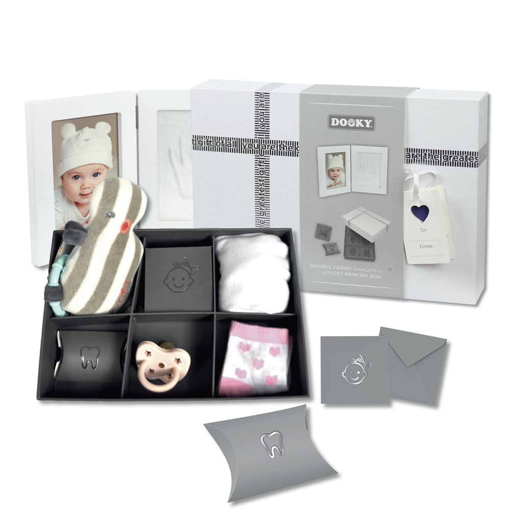 Zestaw Dooky Podwójna ramka z odciskiem bobasa i MEMORY BOX to stylowe i sentymentalne rozwiązanie — umożliwia umieszczenie zdjęcia dziecka oraz odcisku dłoni lub stópki w eleganckiej ramce, a w wyjątkowym pudełku MEMORY BOX przechowywanie najcenniejszych drobiazgów z okresu niemowlęcego.