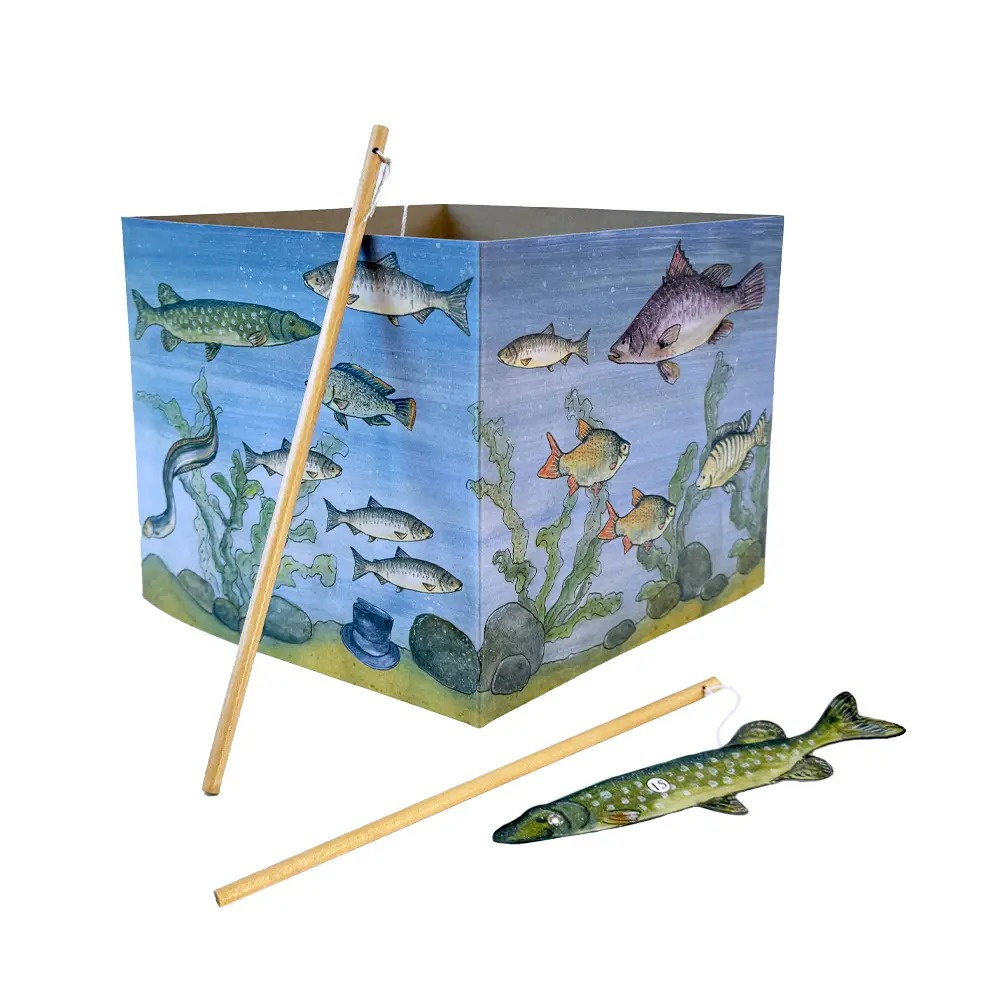 Klasyczna zabawa do ćwiczenia koordynacji ręka – oko. Gra wędkarska. Włóż rybki, but i kapelusz do akwarium. Spróbuj złowić ich jak najwięcej i zlicz punkty!