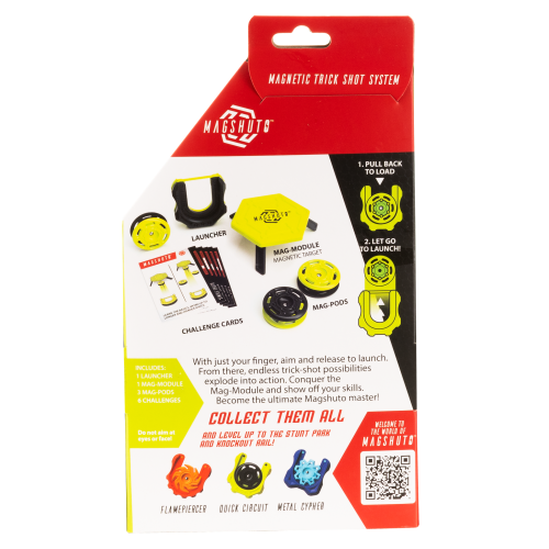 MagShuto to zestaw do wykonywania magnetycznych trick-shotów, dzięki wykorzystaniu magnesów i mechanizmu wyrzutni. MagShuto Żółty jak neonowy błysk zawiera: wyrzutnię, cel (bazę) Mag-Module, 3 dyski (magnetyczne kapsle) Mag-Pody, 6 kart wyzwań. Zestaw jest w żółto-czarnej kolorystyce.