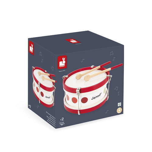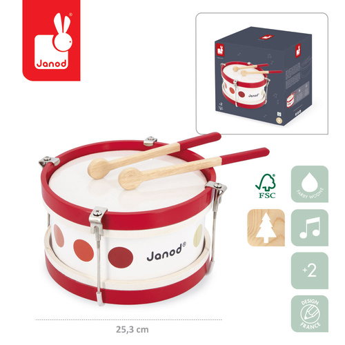 Bębenek francuskiej marki Janod to klasyczna zabawka muzyczna, która wprowadza dziecko w świat rytmu. W zestawie znajdują się dwie drewniane pałeczki, umożliwiające energiczne muzykowanie i swobodne wyrażanie siebie poprzez dźwięk. Solidna konstrukcja sprawia, że jest to doskonały wybór dla małego odkrywcy dźwięków.
