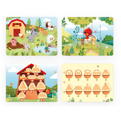 Książeczka z zadaniami Busy Book Farma marki Janod to edukacyjna książeczka sensoryczna dla dzieci, która wspiera rozwój poprzez kreatywną i angażującą zabawę. Książeczka zawiera 22 strony oraz 15 różnorodnych aktywności, takich jak dopasowywanie kształtów, nauka liczenia, rozpoznawanie liter i pierwszych słów po polsku i angielsku, a także ćwiczenia rozwijające logiczne myślenie i poznawanie świata przyrody oraz życia na farmie (np. zwierzęta, warzywa, cykl życia roślin i zwierząt, emocje).
