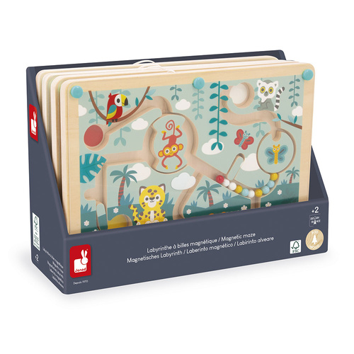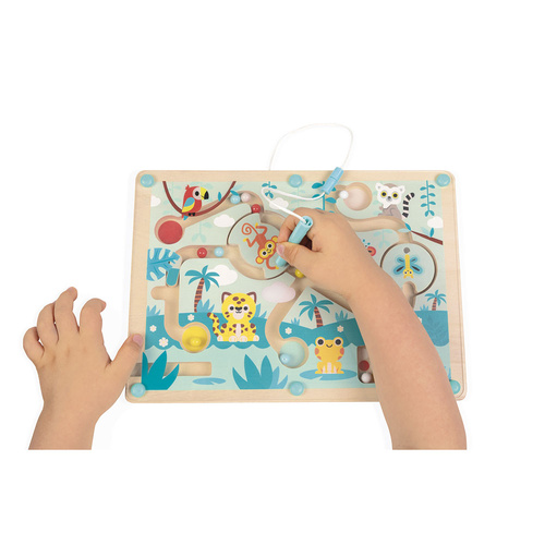 Magnetyczny labirynt Tropik francuskiej marki Janod to angażująca gra zręcznościowa, która uczy malucha cierpliwości i precyzji. Celem jest doprowadzenie 12 kuleczek przez labirynt do odpowiednich egzotycznych zwierząt i odpowiadających im stref kolorystycznych za pomocą magnetycznego rysika. Wyzwanie urozmaicają trzy ruchome przeszkody oraz dwa obrotowe koła z wizerunkiem psotnej małpki i motylka.