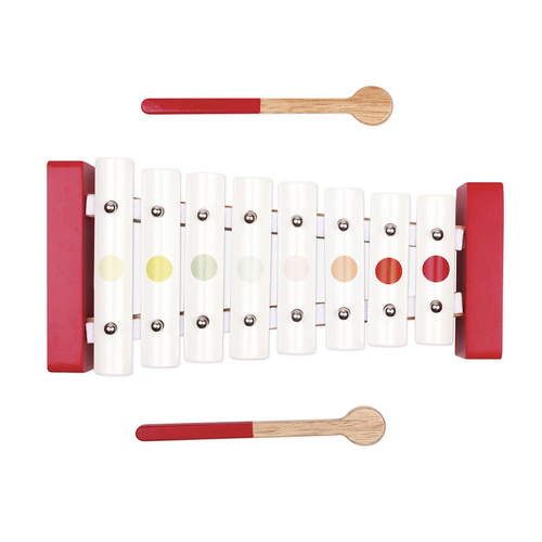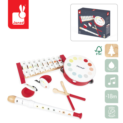 Zestaw zabawek muzycznych francuskiej marki Janod to różnorodny zestaw zabawek muzycznych, który zachęca malucha do radosnego odkrywania bogactwa dźwięków. W skład zestawu wchodzą: tamburyn, flet prosty, 2 kastaniety oraz metalowy ksylofon – cymbałki z pałeczkami. Dzięki różnorodności zabawek maluch może samodzielnie lub z bliskimi tworzyć własne kompozycje, rozwijając przy tym wrażliwość słuchową.