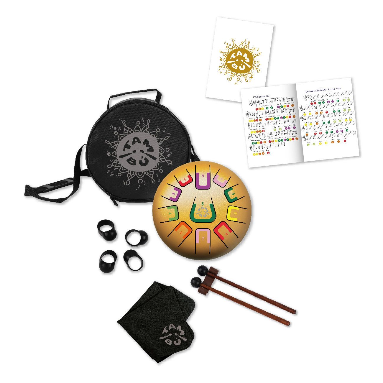 Zestaw zawiera: 2 pałeczki perkusyjne, 4 kostki na palce, zeszyt z nutami i torbę transportową do przenoszenia.