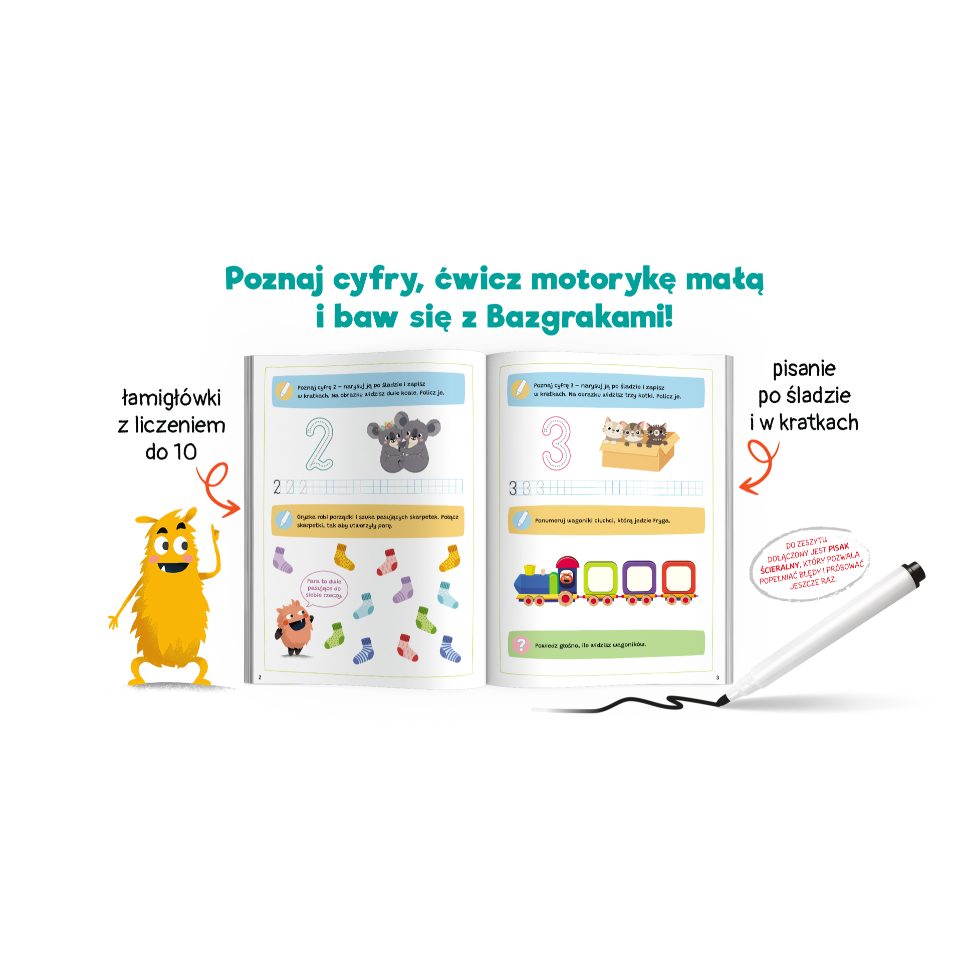Do zeszytu dołączony jest pisak ścieralny – w zestawieniu z odpowiednio przygotowanymi zadaniami pozwoli dziecku pisać, zmazywać, a także wielokrotni rozwiązywać zadania. Ćwiczenia wspierają rozwój grafopercepcji, motoryki małej, koncentracji, spostrzegawczości i logicznego myślenia.