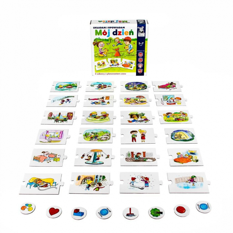 Układam i opowiadam. Mój dzień to wyjątkowe puzzle dla dzieci ukazujące wydarzenia z dnia przedszkolaka. Zaspokoją ciekawość dzieci, które chcą wiedzieć, co i kiedy się wydarzy oraz mieć wpływ na swój plan dnia i tygodnia. 24 dwustronne puzzle to aż 48 scenek do dyspozycji malucha!