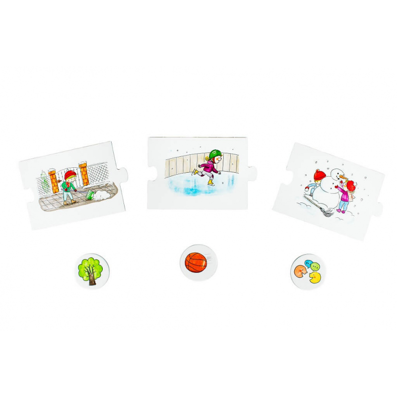 Zachęć dziecko do mówienia i wyrażania myśli oraz uczuć. Puzzle można łączyć w dowolnej kolejności, zmieniać bohaterów wydarzeń, a nawet pory roku. Historie mogą być pełne niespodzianek i zwrotów akcji. Układanie puzzli zachęca do opowiadania, relacjonowania wydarzeń i wyrażania uczuć. Zabawa z układankami buduje świadomość, ile czasu dziecko przeznacza na daną aktywność, odpoczynek lub posiłki. To świetny wstęp do oswojenia domowych obowiązków i przygotowania na nowe wyzwania.