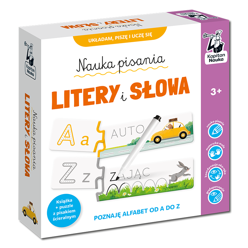 Nauka pisania. Litery i słowa. Książka + puzzle do pisania to kolorowy i obszerny zestaw do nauki pisania dla dzieci od 3. roku życia.
