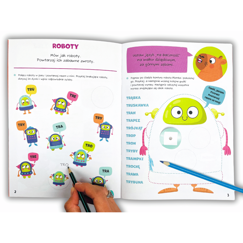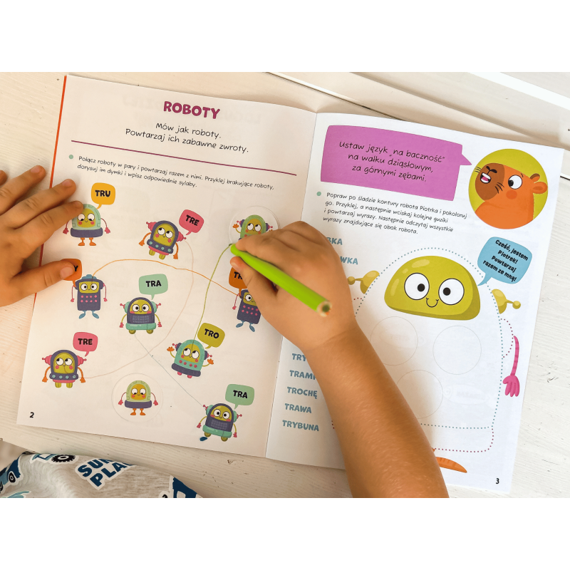 - Zadania opracowane przez specjalistę wspierają rozwój mowy i pomagają w korygowaniu wad wymowy.