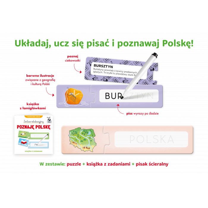 Zestaw przybliża dzieciom hasła i symbole wiążące się z naszą ojczyzną. Książka z różnorodnymi łamigłówkami i pomysłami na zabawy zachęca do poznawania Polski, a dołączone do zestawu puzzle pozwalają rozwijać sprawność grafomotoryczną. W czasie zabawy dziecko nie tylko łączy elementy, lecz także poprawia pisakiem nowo poznane słowa. Ścieralna powierzchnia puzzli umożliwia wielokrotne próby i doskonalenie pisania. Barwne ilustracje zachęcają do zabawy i rozbudzają ciekawość, a umieszczone na rewersie ciekawostki pomagają lepiej poznać geografię Polski, polskie symbole narodowe i tradycje