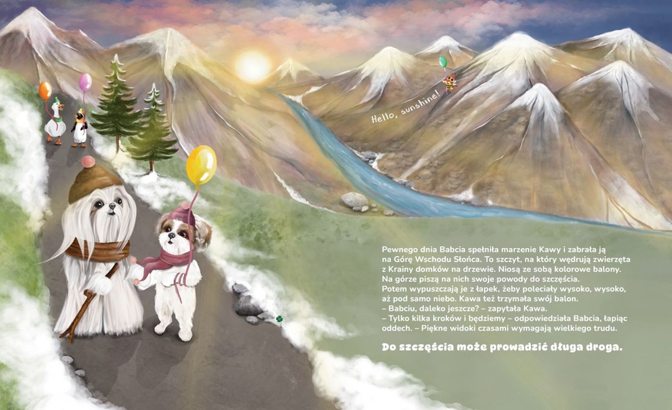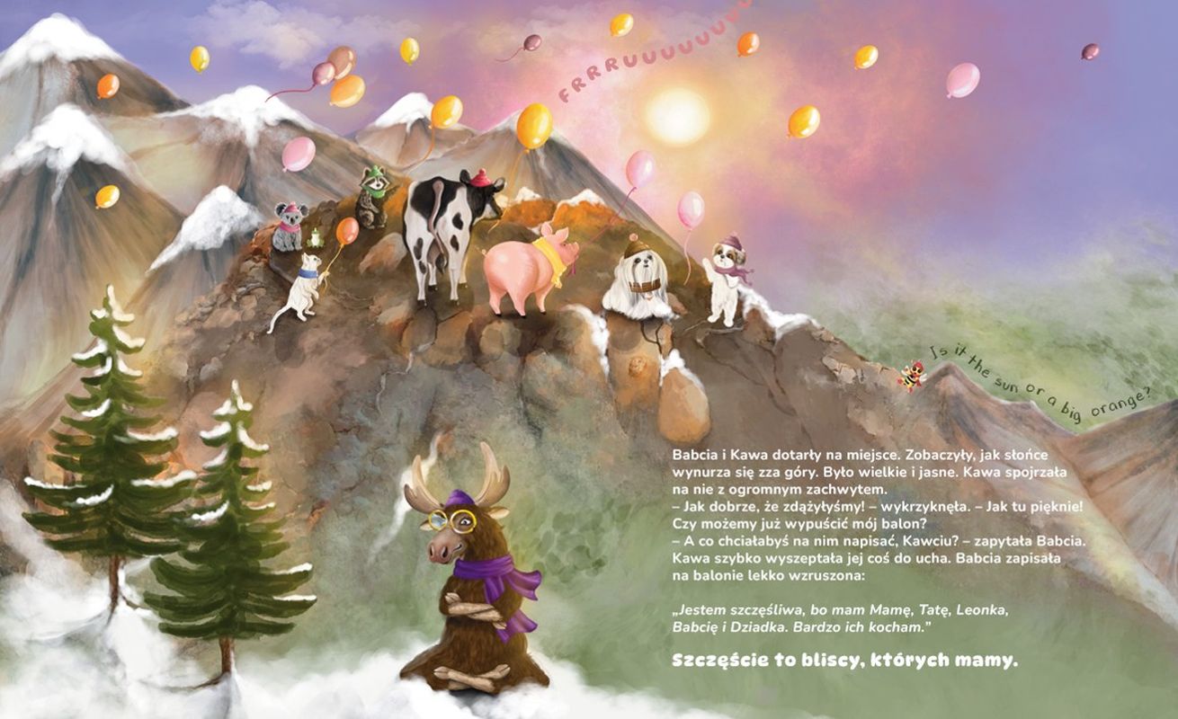 Babcia zabrała Kawę na Górę wschodu słońca. Po dotarciu na miejsce Kawa zauważyła bardzo smutnego łosia. Okazało się, że łoś ma zepsute okulary, więc… nie widzi powodów do szczęścia. Czy rodzinie Kawy uda się naprawić okulary? Czy łoś znowu zobaczy piękno otaczającego go świata? I wreszcie – czy zrozumie, jak wygląda szczęście?