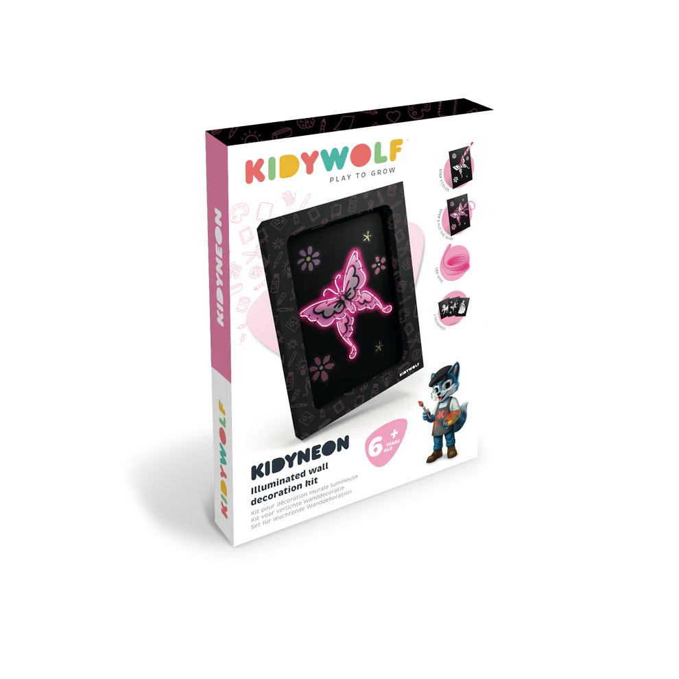 Kidywolf KIDYNEON to wyjątkowy zestaw kreatywny, który pozwala dzieciom stworzyć własny świecący obraz z efektem neonowym. Dzięki specjalnemu neonowemu przewodowi dziecko przeplata go przez przygotowane otwory w planszy, tworząc kolorową, podświetlaną dekorację.