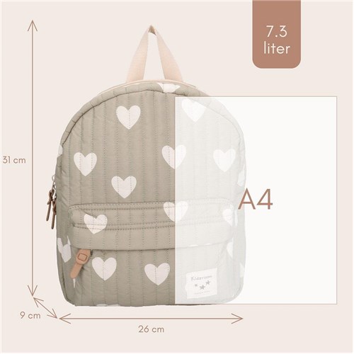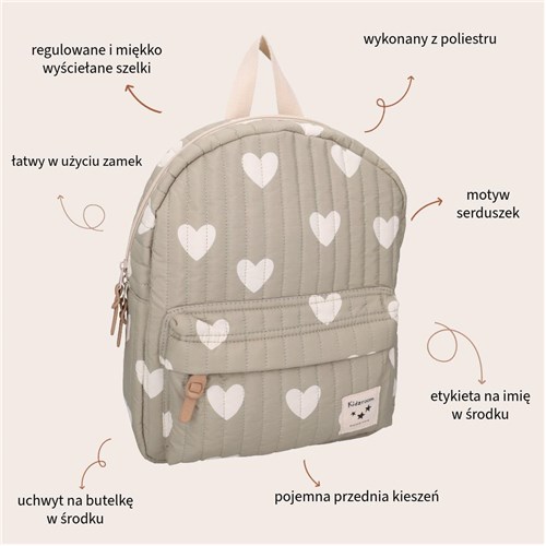 Ten uroczy pastelowy miętowy plecak ze wzorem w małe serduszka to doskonały wybór dla malucha na każdą przygodę! Należący do czarującej kolekcji Wonderful Worlds holenderskiej marki KIDZROOM, plecak szybko stanie się ulubionym akcesorium Twojego dziecka. Ozdobiony radosnym nadrukiem serduszek na całej powierzchni, plecak doda radości każdemu strojowi, a charakteru dodają pionowe przeszycia.