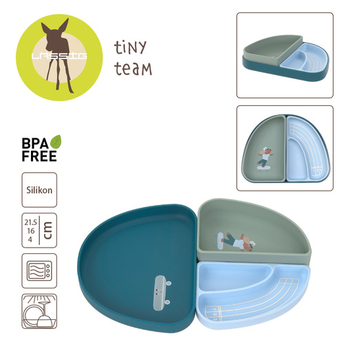 Zestaw silikonowych naczyń z kolekcji Tiny Team niemieckiej marki LASSIG to innowacyjne rozwiązanie, które sprawia, że każdy posiłek staje się zabawą. Komplet składa się z trzech części, które można używać razem jako talerz z przegródkami lub osobno. Miękki i bezpieczny silikon jest idealny dla małych dzieci, a grafika pieska na deskorolce zachęca do odkrywania zawartości naczyń.