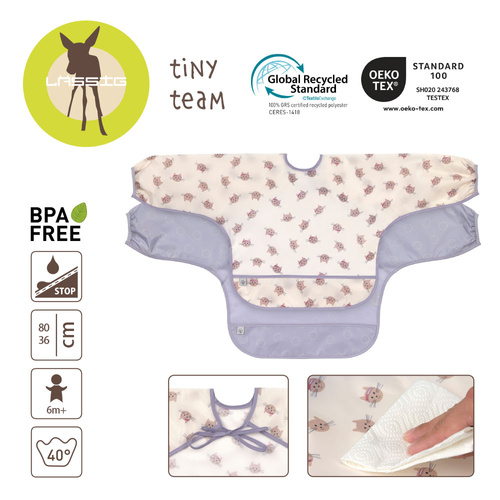 Zestaw śliniaków z długim rękawem z kolekcji Tiny Team niemieckiej marki LASSIG zapewnia pełną ochronę ubrań podczas pierwszych prób samodzielnego jedzenia oraz zabaw plastycznych. Komplet zawiera dwie sztuki wykonane z ekologicznego materiału z recyklingu. Długie rękawy zakończone ściągaczami zapobiegają zabrudzeniom, a elastyczne wiązanie pozwala na precyzyjne dopasowanie do sylwetki dziecka.