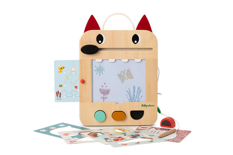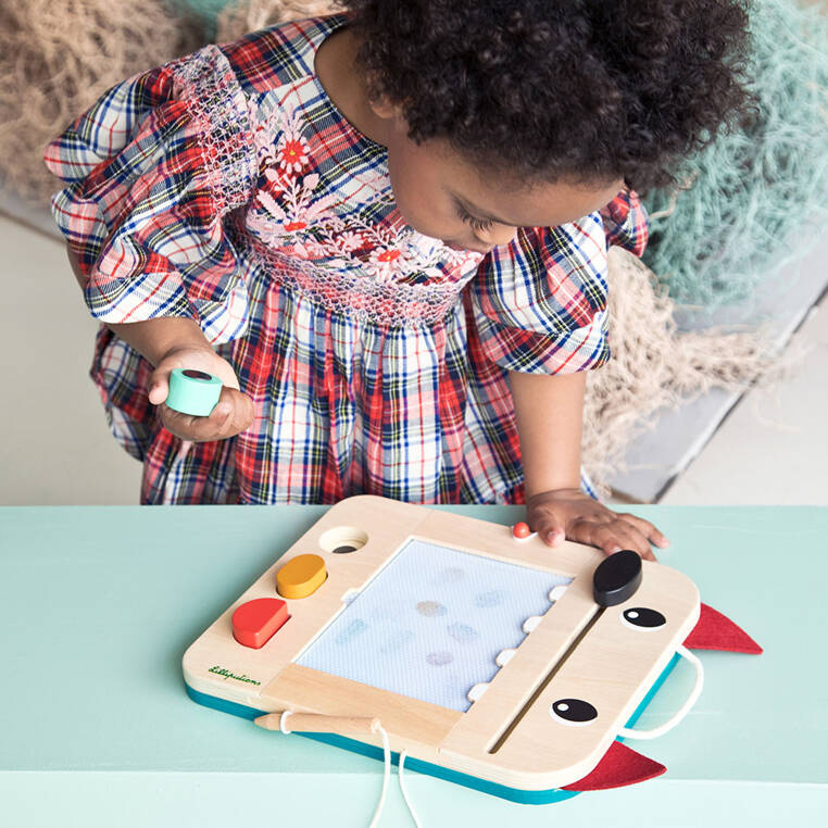 Drewniana tablica-znikopis z kolekcji Wilk Louis belgijskiej marki Lilliputiens to niebanalne źródło rozrywki i nauki dla ciekawskich maluszków. Zabawka ma kształt otwartej paszczy wilka, wnętrze której stanowi ekran, przeznaczony do rysowania. W zestawie znajduje się 6 kart z propozycjami zabaw, 3 magnetyczne klocki w różnych kształtach, które można odciskać na tablicy, pisać nimi lub tworzyć rysunki w różnych kolorach. Miejsce na te magnesy jest w dole planszy. U góry umieszczony jest nos wilka, dzięki przesuwaniu którego można wyczyścić ekran i zacząć od nowa. Tabliczka ma też filcowe wilcze uszy i sznurek do zawieszenia. Została solidnie wykonana, jest w pełni bezpieczna, pomalowana farbami na bazie wody. Zaskakuje i pobudza dziecięcą wyobraźnię. Rozwija koordynację ręka-oko, małą motorykę, aktywizuje zmysł wzroku. Idealnie nadaje się na prezent.