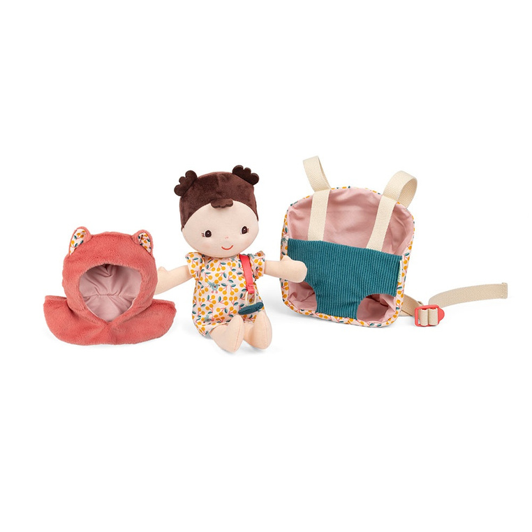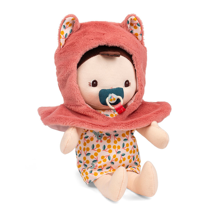 Lalka-dzidziuś w nosidełku Jeanne belgijskiej marki Lilliputiens jest idealna do zabierania na wycieczki, tulenia, usypiania czy uspokajania. Laleczka ma poręczny rozmiar – 24 cm, brązową fryzurkę, wygodny strój (zdejmowany ramper w uroczy wzór z przyszytym smoczkiem, który dzięki magnesowi można umieścić przy jej ustach, by nie spadał podczas spacerów) oraz niezbędne akcesoria: nosidełko na regulowanych szelkach, które łatwo dopasować do dziecka, i ciepły kaptur-czapeczkę w formie pelerynki z kocimi uszkami.