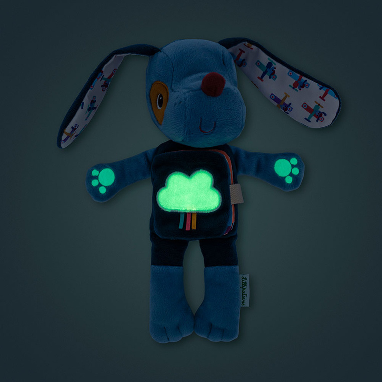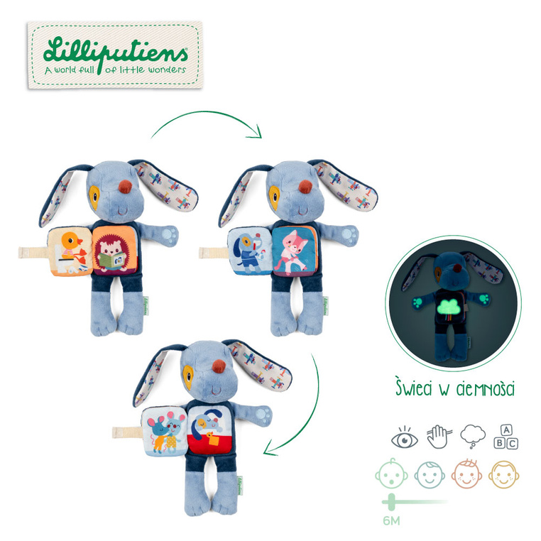 Książeczka-przytulanka aktywizująca Piesek Jules belgijskiej marki Lilliputiens to idealna pierwsza lektura i jednocześnie uroczy przyjaciel maluszka. Brzuszek pieska to miękka książeczka, na stronach której pojawiają się zwierzątka z ekipy Lilliputiens m.in. Kaczorek Gaspard czy Kotka Jeanne, prezentujące swoją wieczorną rutynę przed snem – zakładanie piżamki, mycie ząbków czy buziak na dobranoc. Dodatkową atrakcją jest chmurka na pierwszej stronie oraz wnętrze łapek pieska, które świecą w ciemności. Dzięki fluorescencyjnym elementom Jules staje się doskonałym towarzyszem do zasypiania i doskonałą alternatywą dla lampki nocnej – delikatnie rozprasza mrok, daje dziecku poczucie bezpieczeństwa i ułatwia odnalezienie przytulanki w nocy.