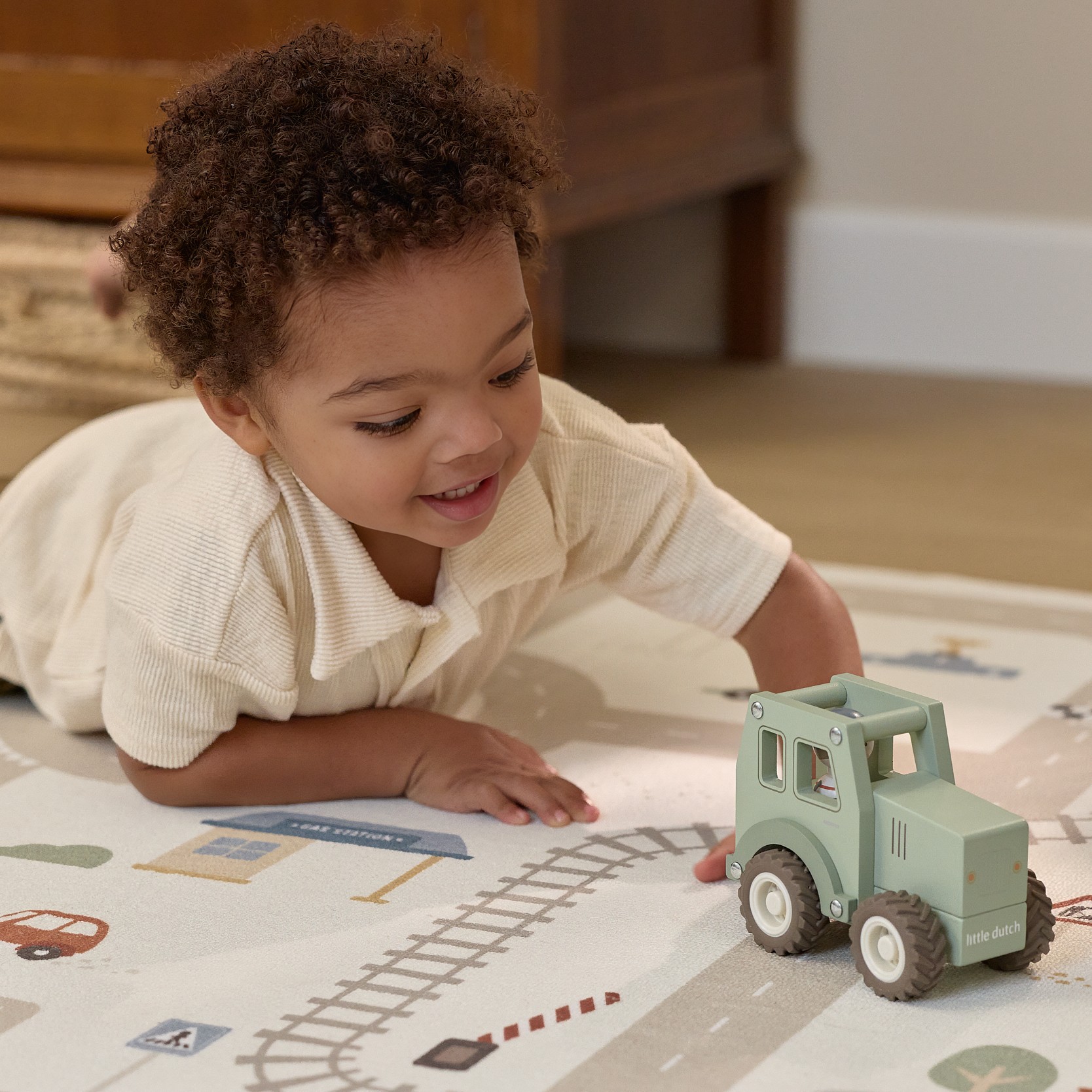 Drewniany traktor w delikatnym, zielonym odcieniu zaprasza dzieci do wspólnej przygody z sympatycznym farmerem za kierownicą. To zabawka, która od pierwszego spojrzenia budzi ciekawość i zachęca do tworzenia własnych historii. Solidne, gumowe opony zapewniają stabilną jazdę, a trwałe drewno gwarantuje bezpieczeństwo i długie użytkowanie. Traktor świetnie łączy się z innymi pojazdami, otwierając przed dzieckiem jeszcze więcej możliwości kreatywnej zabawy i odkrywania świata w radosny, beztroski sposób.