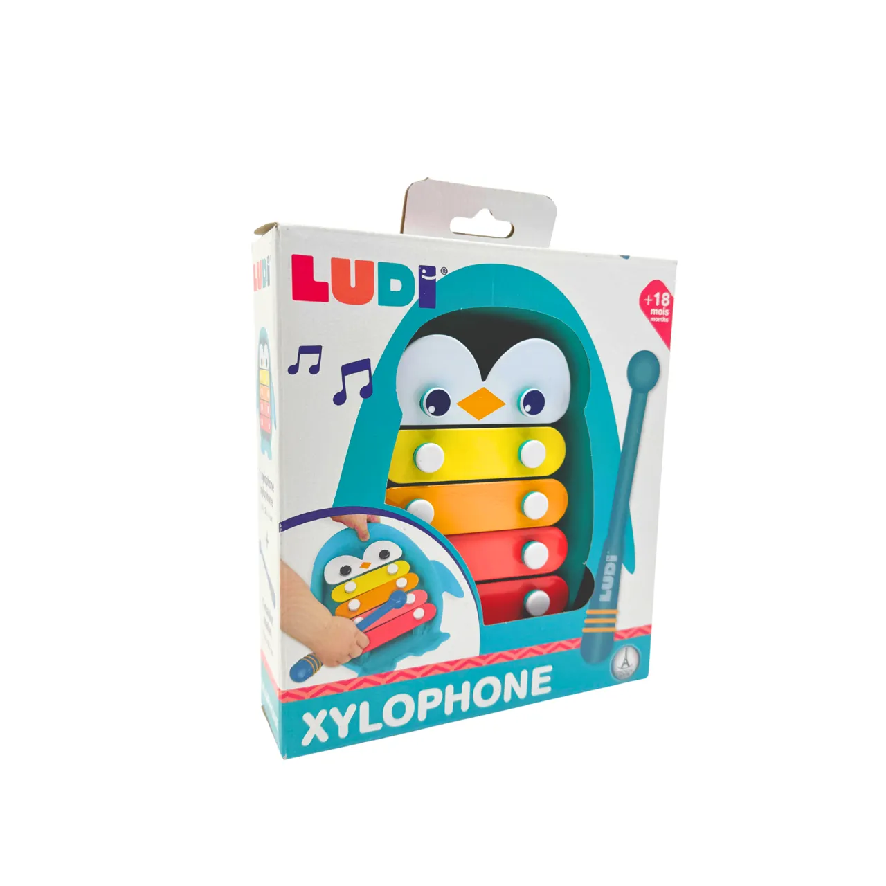 Pięć kolorowych blaszek wydaje różne dźwięki, zachęcając dziecko do eksperymentowania z rytmem i słuchania efektów własnych działań. Ergonomiczna pałeczka w formie wiosła została zaprojektowana tak, aby dobrze leżała w małych dłoniach i ułatwiała pierwsze muzyczne próby.