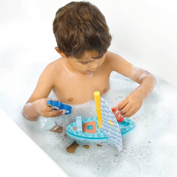 Żaglówkę wykonano z miękkiej i przyjemnej w dotyku pianki EVA, która naturalnie unosi się na wodzie. Materiał jest lekki, odporny na działanie wody i łatwy do utrzymania w czystości, dzięki czemu zabawka dobrze sprawdza się podczas intensywnego, codziennego użytkowania – w domu i na zewnątrz.