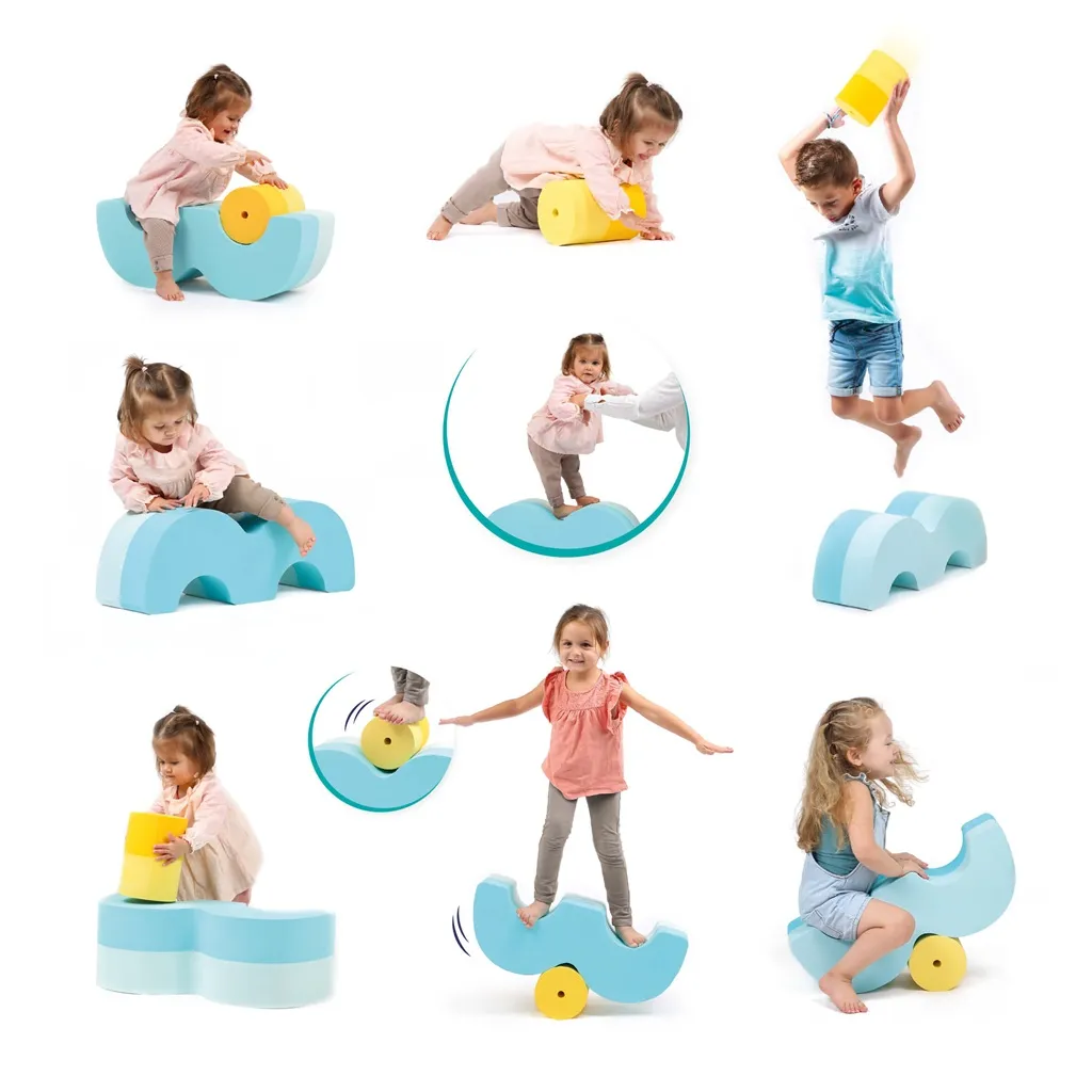 Zestaw składa się z dwóch uzupełniających się elementów: modułu falistego i modułu cylindrycznego. Ich zróżnicowane kształty pozwalają na stopniowe rozwijanie umiejętności ruchowych: