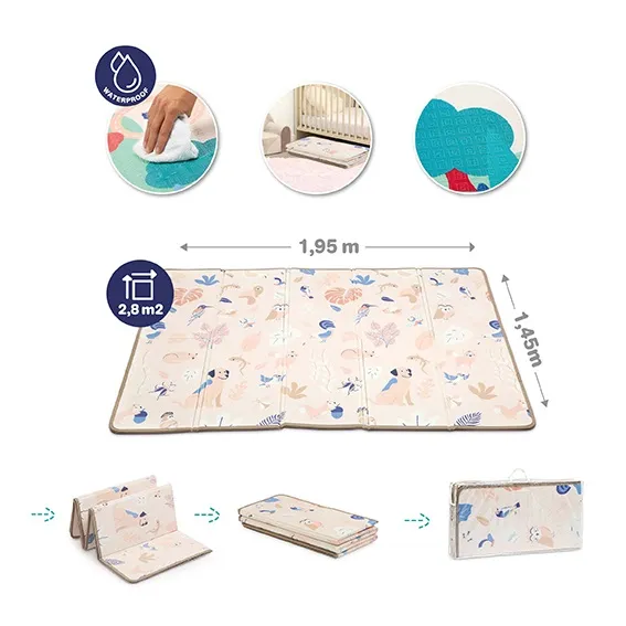 Ten model o imponującym formacie 195 × 145 cm pozwala dziecku swobodnie raczkować, turlać się, wstawać, budować, odgrywać scenki i bawić się razem z rodzeństwem. To rozwiązanie, które łączy funkcję maty niemowlęcej z komfortową strefą zabawy dla starszych dzieci.