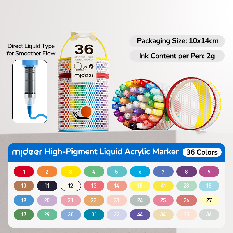 mideer: markery akrylowe płynne z pędzelkową końcówką 36 kolorów w tubie
