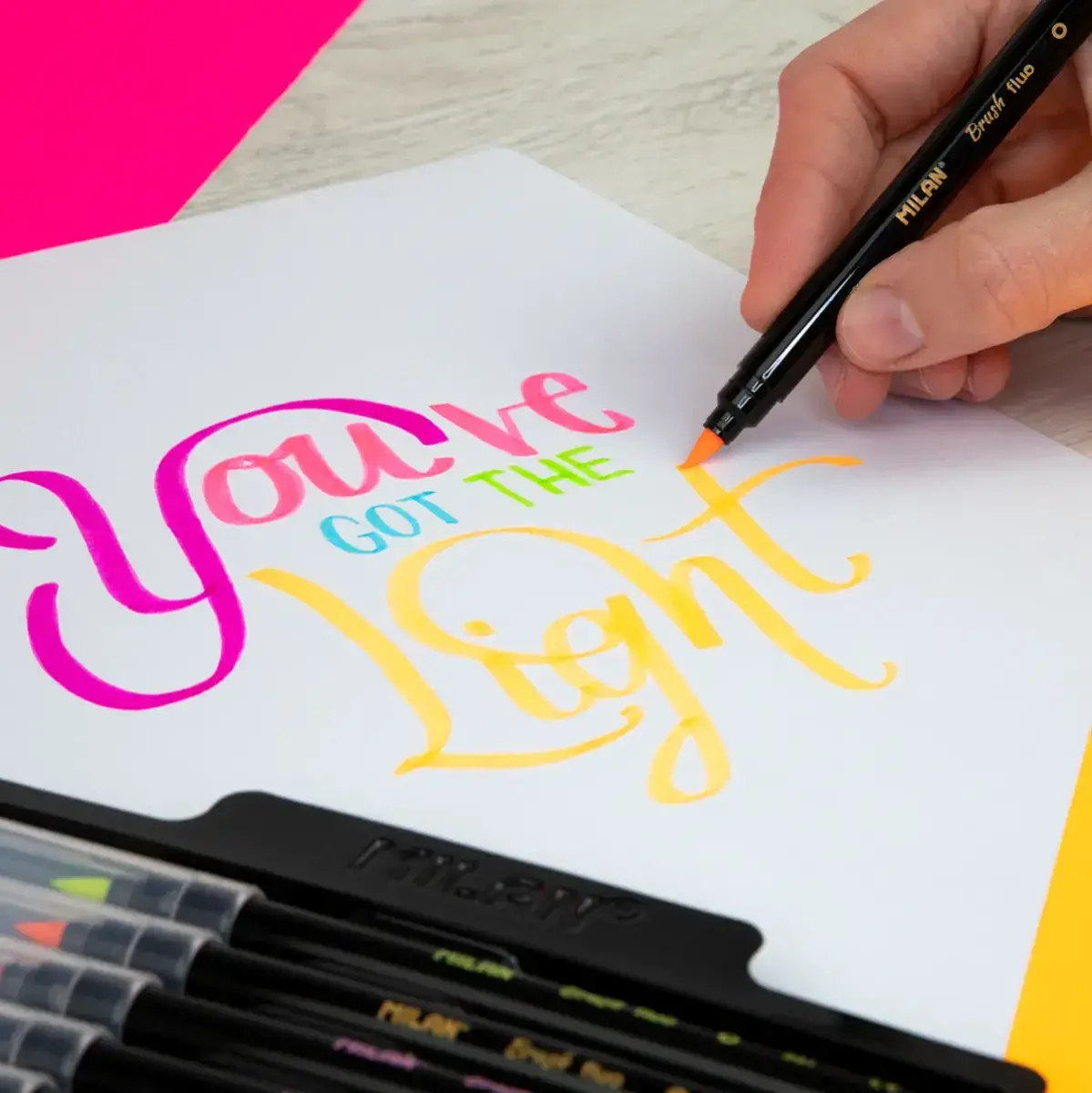 Flamastry z wytrzymałą, elastyczną, nylonową końcówką w kształcie pędzelka. Idealne do kaligrafii, liternictwa i malowania zróżnicowanych kresek oraz mieszania kolorów. Pędzelkowa końcówka pozwala na rysowanie cienkich i grubych linii od 0,5 mm do 6 mm. W opakowaniu 6 FLUO kolorów: żółty, pomarańczowy, różowy, fioletowy, niebieski, zielony. Tusz na bazie wody tworzy jaskrawe i intensywne kolory, które można ze sobą mieszać. Tusz można łatwo wyprać z większości tkanin (moczyć tkaninę w zimnej wodzie przez godzinę, a następnie prać w pralce w niskiej temperaturze). Bezpieczna perforowana skuwka, przezroczysta. Flamastry MILAN są zgodne z europejskimi (EN 71/III) i amerykańskimi ASTM D4236) normami bezpieczeństwa. Nie zawierają ftalanów, metali ciężkich i innych substancji toksycznych. Są bezpieczne dla dzieci. Rozmiar flamastra: 15,6 x Ø 1 cm. Rozmiar opakowania: 19 x 12 x 1 cm.