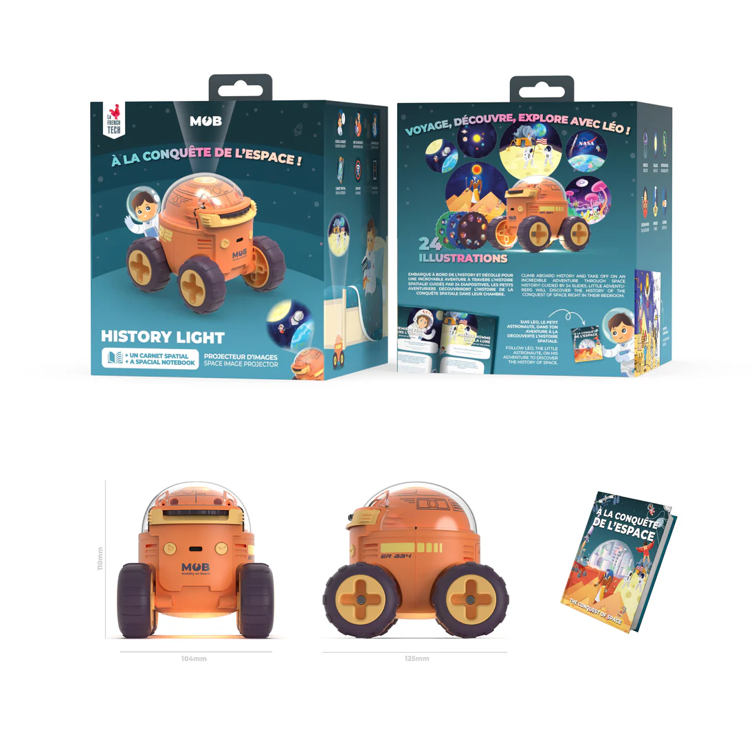 W zestawie znajduje się także książeczka z opisami, dzięki której każde dziecko może uczyć się i odkrywać tajemnice wszechświata, nie wychodząc z pokoju. Gdy podróż dobiega końca, Projektor Łazik zmienia się w delikatną lampkę nocną, która czuwa nad snem młodego astronauty.